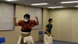 ゆっくり時間を掛けて床柔軟や体操が終わったら、よさこいの動きを覚えながら身体をあたため、うるっしー指導の元発声練習。